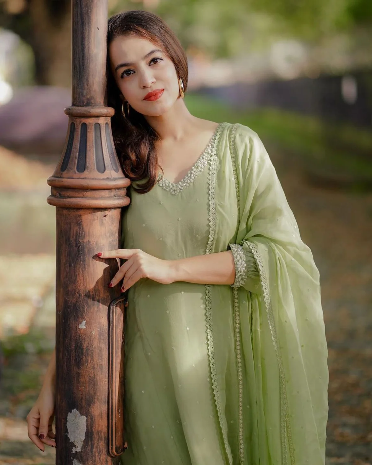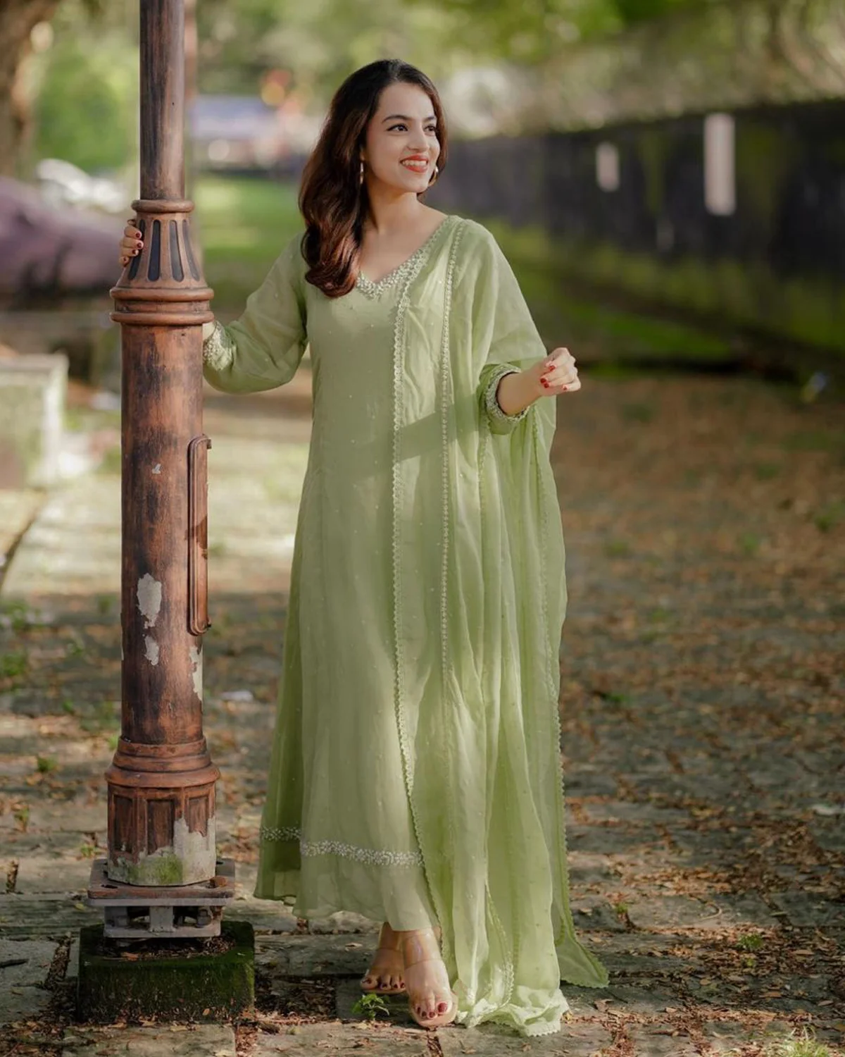 Elegant pastel green Anarkali suit with delicate embroidery, perfect for festive occasions and casual events.